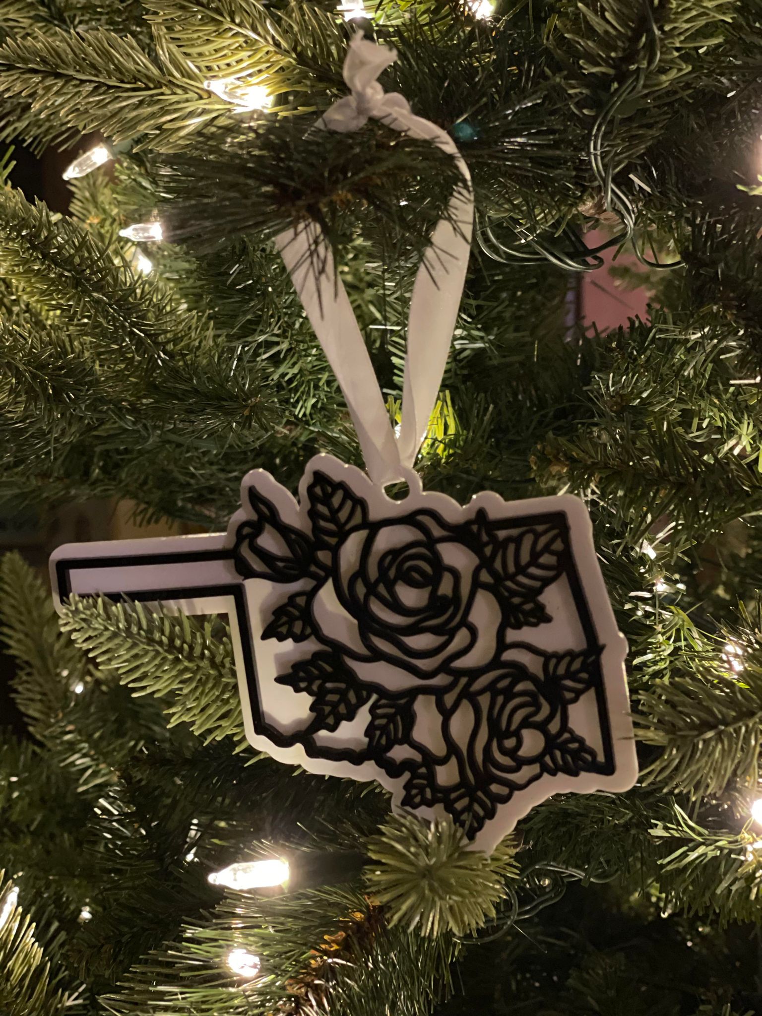 Enhance your holiday decor with our stunning State Pride Floral Ornaments crafted from black and white acrylic. Each ornament features the state outline adorned with an intricate flower overlay, adding a touch of elegance to your Christmas tree or making a stylish statement hanging from your car mirror. Currently available in Washington and Oklahoma states, these ornaments are customizable for other states as well. Simply add your preferred state in the comments during ordering, and we'll happily accommodate your request.